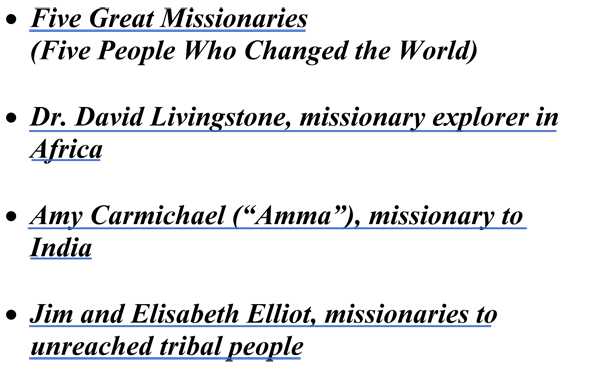 Five People Who Changed the World Dr. David Livingstone Amy Carmichael Jim and Elisabeth Elliot